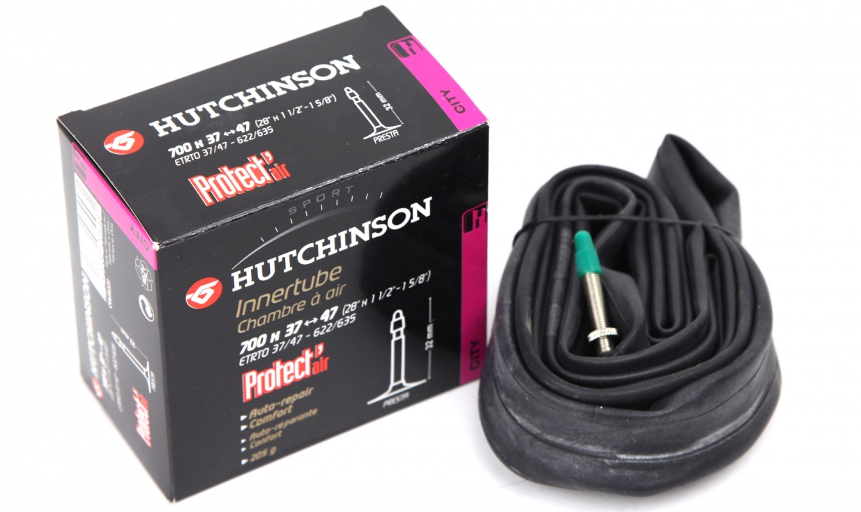 Camera d’aria in butile con liquido preventivo Hutchinson Protect’Air che ripara immediatamente le forature (fino a 3 mm).