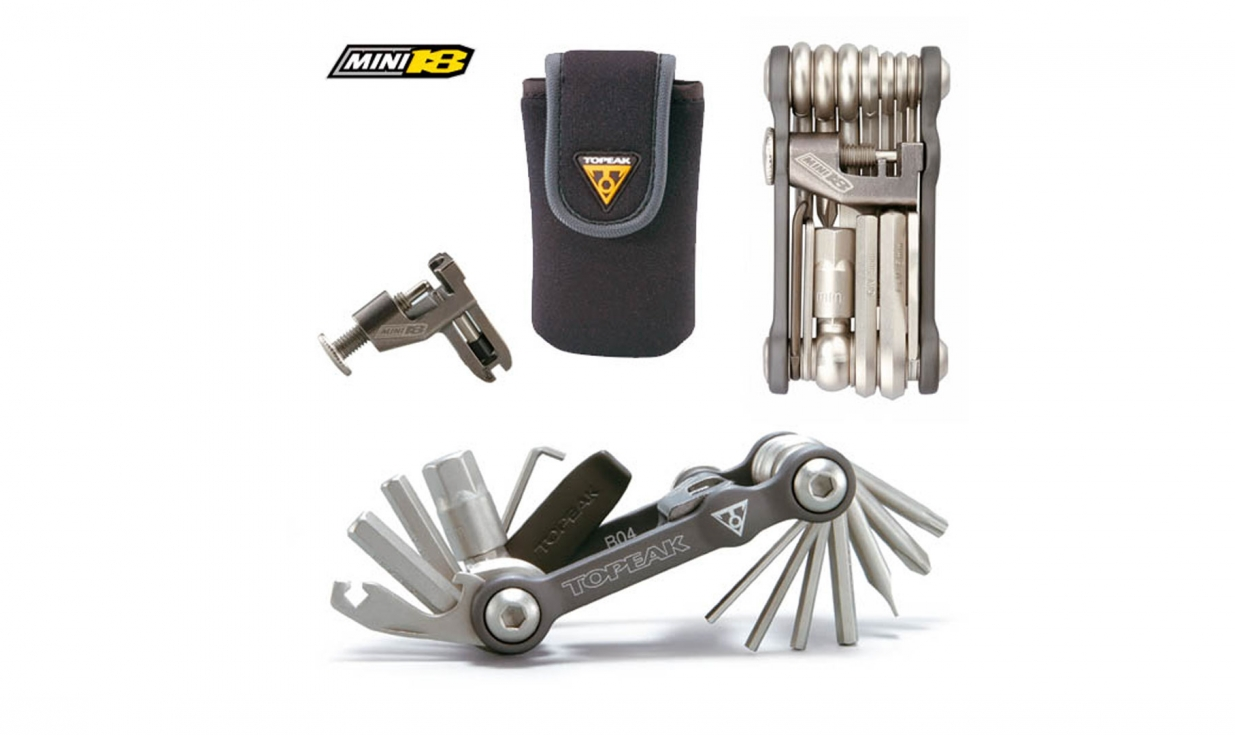 18 attrezzi di qualità professionale in acciaio duro con corpo in alluminio legato. Custodia in neoprene compresa con il multiattrezzo.