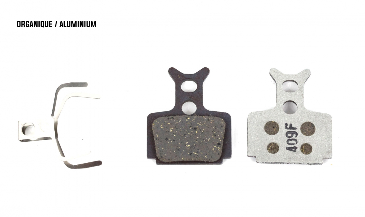 – Le pastiglie organiche (resina che serve da legante a un basso tasso di metalli) offrono una frenata potente, un rodaggio molto veloce ma una durata piuttosto breve. Sono sensibili ai forti aumenti di temperatura (lunghe discese) e sono quindi da preferire per le condizioni asciutte e i percorsi piani o collinari.